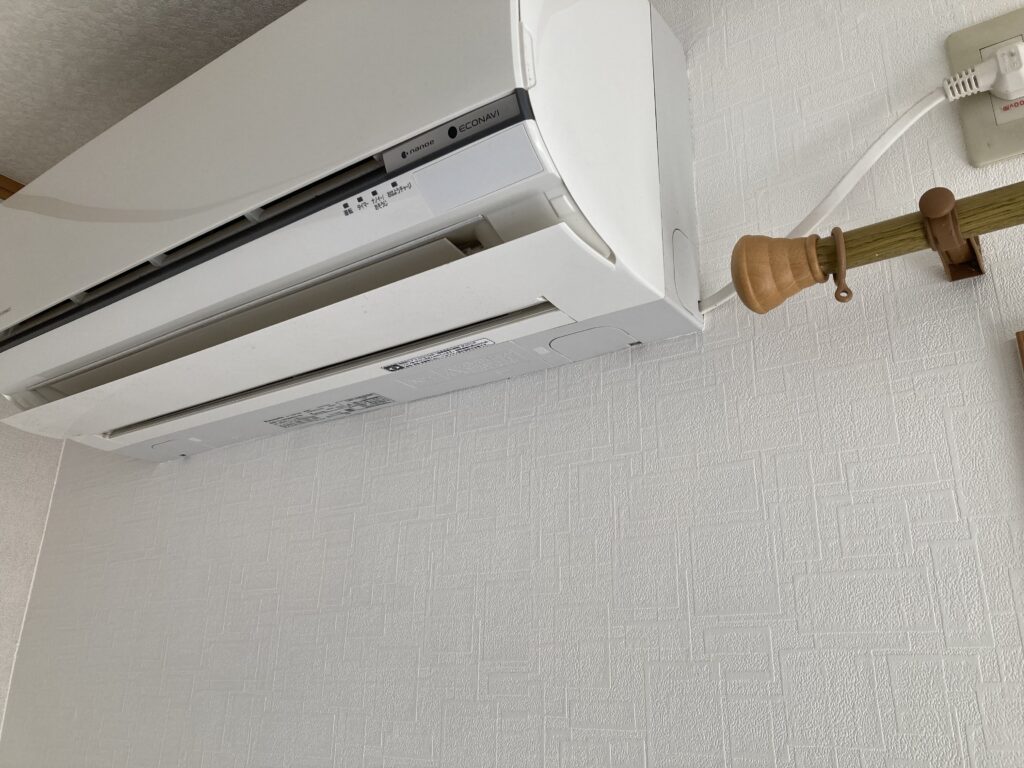 震災被害によるき裂で、内部の石膏ボードまで割れていたので部分的に交換致しました。エアコンの脱着なく施工致しました。
